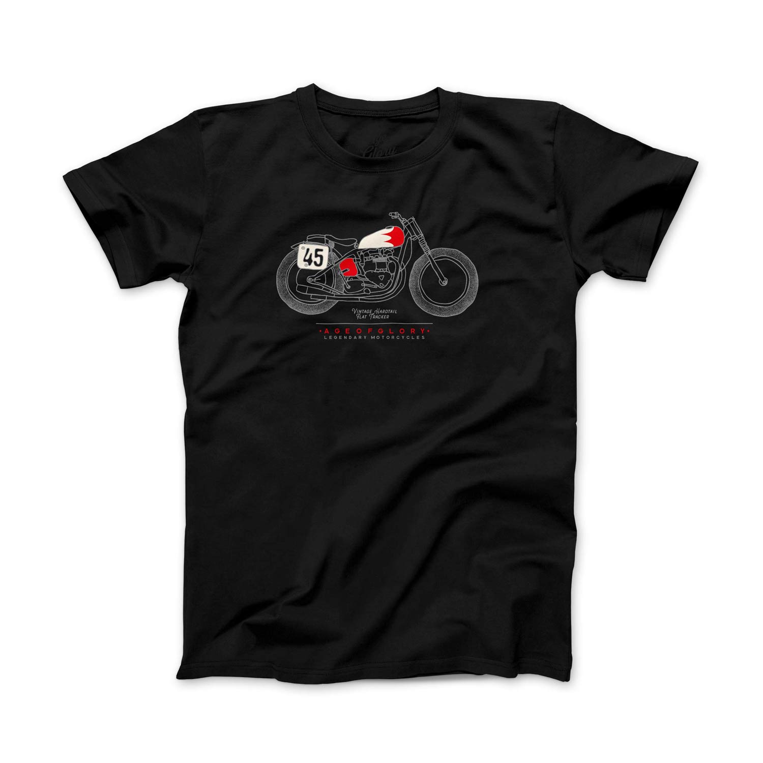 Dieses T-Shirt zeigt ein Motorrad mit starrem Rahmen, basierend auf einer Triumph, im klassischen Vintage-Tracker-Look.