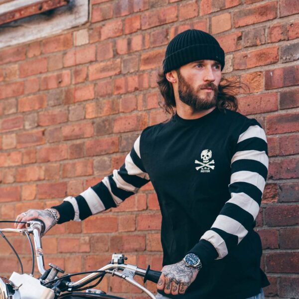 Arborant notre crâne de pirate vintage sur le cœur, ce t-shirt à manches rayées est un classique : un style intemporel et un look à porter en toutes circonstances. - 100% coton - 200g - Rayures teintées dans le tissu - Sérigraphie sur le coeur - Manchons rallongés aux poignets