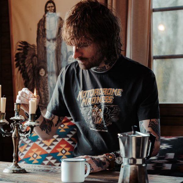 Ce tee-shirt en coton est un hommage aux pilotes pionniers qui pilotaient des vieilles motos sur des pistes en bois. C’était le tout début de la course de moto : pas vraiment de préoccupation sécuritaire, juste des grosses c@%*$ et plein gaz ! C’était une vraie folie. Cela fait partie de l’histoire des courses de motos. - Tee-shirt coton 180g - packaging popcorn