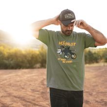En l’air ou sur l’asphalte, peu importe que votre monture ait des ailes ou des roues, vous devez braver les éléments et foncer vers votre objectif, sans compromis ! Tapi dans l’ombre, vous attendez le crépuscule pour sévir… Le Tee-shirt Ace pilot est un clin d’œil aux patchs qu’arboraient les pilotes de bombardiers dans les années 40/50.