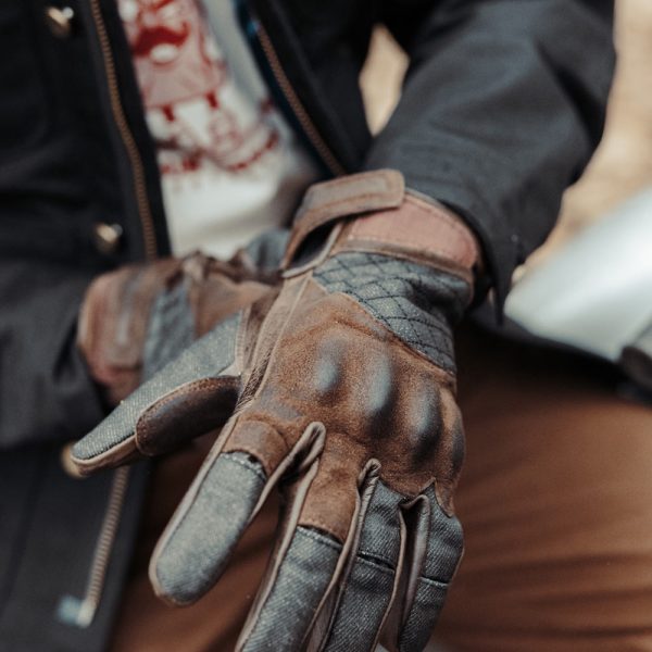 This pair of gloves is definitely an original and styled pair of motorcycle gloves. With integrated knuckle protectors, the shifter gloves offer a good comfort in an original mix of coated denim fabric and nubuck leather. A great style to hit the road safely. - Nubuck leather - Coated denim - Integrated knuckle protector - CE/UKCA EN13594