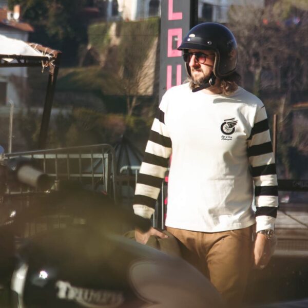 89,00€Original price was: 89,00€.44,50€Current price is: 44,50€.This long sleeves T-shirt is resolutely inspired by the vintage jerseys worn by the riders of the 70s: a unique and old-school look with stripes on the sleeves and longer ribbed edges on the wrists. Made of thick cotton, this T-shirt is very comfortable to wear and will give you the perfect vintage style touch. - 100 % Cotton - 220g - screen print on the chest - embroidered patch on the right sleeve -