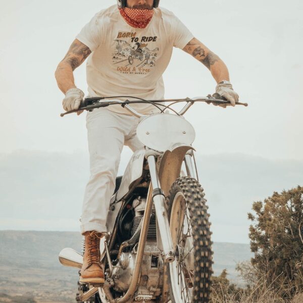 42,00€Original price was: 42,00€.29,40€Current price is: 29,40€.Motorcycling is synonym of freedom, especially scrambling. Nothing is better than to put your gears on you, fill a backpack, a rolled tent on your rear fender and go straight into the wild? without any real goal except being free and looking for the great escape. This tee-shirt will be then essential! - 100% cotton - Design is screenprinted on the chest - Sold in a popcorn packaging -